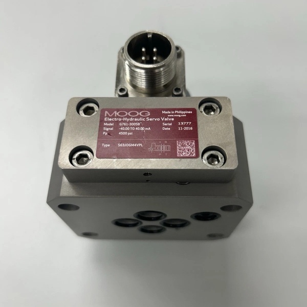 The MOOG G761-3005 is a two-stage electrohydraulic servo valve from the G761 Series, designed for precision control of hydraulic actuators in industrial systems requiring stable performance under fluctuating load and pressure conditions. As a core component in closed-loop control architectures, it interfaces electronic controllers (e.g., PLCs, motion controllers) with hydraulic actuators (cylinders, motors), converting low-power electrical command signals into proportional hydraulic flow and pressure to regulate actuator position, velocity, or force.
